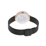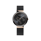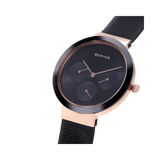 The black dial is gracefully and seamlessly framed by the polished rose gold-colored stainless steel case, which is composed of premium, pure medical-grade stainless steel (316L). An exceptionally durable, transparent, and scratch-resistant sapphire crystal guards this. The integrated multifunction displays (24-hour, date, and day) on the dial, along with the ceramic's sleekly burnished "Smooth Touch" finish, which makes the material comfortable to the touch, complete the Nordic beauty aesthetic.