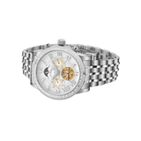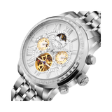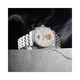 An automatic watch that blends classic style with fine engineering is the Britime Orbit. The watch has a silver dial with Roman numeral markers and multi-functional sub-dials that show the day, date, and time of day and night. While the open-heart design at 6 o'clock displays the complex automatic movement, the moon phase complication at 12 o'clock adds a hint of cosmic splendor. The Orbit is a sophisticated option that is appropriate for both professional and informal settings. It is made of polished stainless steel and features a stylish linked bracelet.