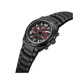 Ducati DT019 channels the aerodynamic DNA of the brand with a case shape that echoes the iconic curve of Ducati’s logo. Crafted in brushed and polished ion-plated black stainless steel, this 43.5 x 51.5mm chronograph delivers sharp presence and muscular elegance. The black bitumen-textured dial - gritty and road-inspired - features three sub-eyes with black backgrounds and red hands for a hit of racing aggression. Ion-plated black topring, crown, pushers, and a full steel bracelet reinforce its all-metal power. With 5 ATM water resistance and precision quartz chronograph function, DT019 is built for riders who is relentless.