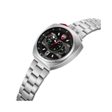 The dominating bullhead casing of the DT025 chronograph, which is designed to stand out, puts the pushers to the top, giving control where it matters most. A black dial that defies convention is framed by a stainless steel case that combines polished and brushed finishes. A screwed-in core component gives the surface a mechanical depth, while a layered honeycomb texture serves as the background. Sub-dials are placed on either side of the dial, which is anchored by a single hour hand. This watch has attention-grabbing design mechanics and is finished with a stainless steel strap.