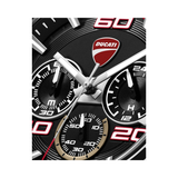 Ducati's race-ready mindset shaped this daring chronograph. Three sub-dials are organized like clustered gauges, and the black dial has red accents. At-a-glance time is provided by the white and red-marked tachymeter ring. With color-accented pushers on either side, the vertically fluted crown provides safe control. This watch is sealed under curved mineral glass, finished in ion-plated black, and has a high-grip red silicone band. It is precisely calibrated.