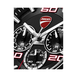 Ducati's race-ready mindset shaped this daring chronograph. Three sub-dials are organized like clustered gauges, and the black dial has red accents. At-a-glance time is provided by the white and red-marked tachymeter ring. With color-accented pushers on either side, the vertically fluted crown provides safe control. Every aspect of this watch, which is anchored by a high-grip red silicone band, contributes to Ducati's unwavering drive.
