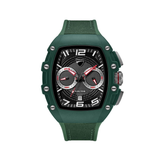 The DT013 is inspired by Supermoto's daring geometry, which is angular and forceful. Its green matte tonneau case locks in with screwed detailing. For speed and functionality, the dial is divided into black and gray, with two sub-dials designated in white with red accents. The date window at six o'clock is inconspicuous. Tactile grip and structure are added by the green silicone strap, which has a nylon top layer.