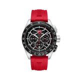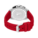 The Ducati DT015 is designed with bold styling and unadulterated performance in every aspect. Finished in industrial-grade brushed and polished textures, the 44x52.5mm case demands attention. Split-second accuracy is provided by a high-precision quartz chronograph mechanism within. A black multi-layer dial with mechanical depth is topped by a curved mineral glass, and red accents honor Ducati's Italian racing history. With a high-grip profile, the red, cozy silicon strap provides race-ready comfort.
