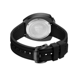 The dominating bullhead casing of the DT025 chronograph, which is designed to stand out, puts the pushers to the top, giving control where it matters most. A black dial that defies convention is framed by an ion-plated black case that combines polished and brushed finishes. A screwed-in core component gives the surface a mechanical depth, while a layered honeycomb texture serves as the background. Sub-dials are placed on either side of the dial, which is anchored by a single hour hand. The arrangement is finished with bold numerals, radial details, and a three-color accent on the dial.