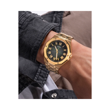This elegant and intricately detailed analog timepiece from GUESS's Asset line is designed specifically for metropolitan men. The green circular dial is housed in a 42.5 mm casing and is driven by a quartz movement. It has two simple hands and a crown that allows you to change the time. The watch's appearance is enhanced by the golden hue of the stainless steel strap. Additionally, a push-button clasp is included to guarantee a snug fit on the wrist.