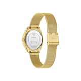 Wear this women's analog timepiece from Guess's Mini Luna collection to show off your sense of style. Its gold-colored stainless steel band enhances the watch's appearance. The gold circular dial is protected by a mineral glass and housed in a 30 mm casing. It shows three simple hands. Additionally, it has a fold-over safety clasp with a double push button that ensures a tight fit on the wrist.
