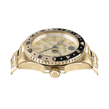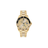 This analog timepiece from PHILIPP PLEIN's GMT-I Challenger range exudes contemporary style and is specifically designed to exude manly charm. Enclosed in a 44 mm case, the gold round dial is secured by a mineral glass. It shows three hands in plain sight. The gold tint emanating from the metal band enhances the watch's appearance. Additionally, it has a push-button deployment clasp that ensures a snug fit on the wrist.